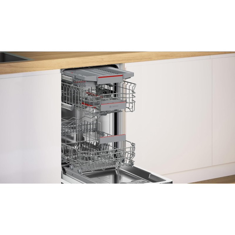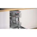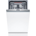 Lavavajillas integrable Bosch SPV4EMX25E de 45 cm de ancho con capacidad para 10 servicios. Formato de integración total para instalación en mueble con panel de puerta no incluido. Incorpora conectividad Home Connect mediante aplicación compatible y sistema de secado EfficientDry con apertura automática de la puerta al finalizar el ciclo. Dispone de 6 programas: Eco 50 °C, Auto 45-65 °C, Intensivo 70 °C, 1h 65 °C, Silencio 50 °C y Favorito. Incluye funciones seleccionables EfficientDry, SpeedPerfect+, Media Carga y Cuidado de la Máquina. Equipa tercera bandeja VarioDrawer, cestas VarioFlex y ajuste RackMatic en la cesta superior. Integra motor EcoSilence Drive, sistema AquaStop, InfoLight y DosageAssist. Nivel de ruido de 44 dB. Dimensiones del aparato: 815 x 448 x 550 mm.
