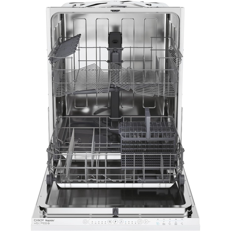 Lavavajillas empotrable Candy CIMC E0W 3E53 con ancho de 60 cm y capacidad nominal para 13 servicios. Electrodoméstico de integración para instalación en mueble de cocina, destinado al lavado de platos, vasos, cubiertos, tazas y otros utensilios aptos para lavavajillas. La estructura incluye puerta frontal, cuba de lavado, cestas interiores para la colocación de la vajilla, sistema de aspersión de agua, filtro, compartimento para detergente y conexiones para entrada y desagüe de agua. El funcionamiento se realiza con suministro eléctrico, agua y productos de lavado para lavavajillas, como detergente, abrillantador y sal regeneradora, según la configuración de uso y la dureza del agua. Referencia del modelo: CIMC E0W 3E53. Marca: Candy. Capacidad: 13 servicios. Tipo de instalación: empotrable. Ancho: 60 cm.