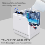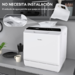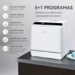Lavavajillas de encimera Hermitlux con capacidad para 4 servicios y ancho de 42,8 cm. La estructura incluye puerta frontal, panel de control y rejilla interior para vajilla. Admite platos de hasta 26,7 cm colocados en ángulo. Dispone de 5 programas de lavado: estándar, rápido, ECO, intensivo y frutas. El sistema de entrada de agua funciona mediante conexión directa al grifo o mediante depósito integrado de 5 litros, según la instalación disponible. Incorpora brazo rociador para el lavado interior y control mediante botones en la parte frontal. Las medidas aproximadas del aparato son 42,8 x 42,5 x 45,8 cm. El producto está diseñado para lavado de platos, vasos, cuencos y cubiertos dentro del límite de carga correspondiente a 4 servicios. Compatible con detergente para lavavajillas en formato habitual según el programa seleccionado y las instrucciones del fabricante.