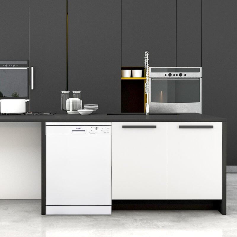 Lavavajillas Svan SJ12600E con capacidad para 12 cubiertos, configuración indicada para una carga completa de vajilla según la referencia del fabricante. Este modelo cuenta con una potencia nominal de 1900 W y dispone de 5 programas de lavado seleccionables. El nivel sonoro declarado durante el funcionamiento es de 52 dB. El aparato presenta un ancho de 60 cm, medida correspondiente al formato de instalación o ubicación del equipo dentro de la categoría de lavavajillas de ese segmento. La referencia SJ12600E identifica este modelo dentro del catálogo de Svan. La combinación de datos técnicos incluye capacidad de 12 cubiertos, potencia eléctrica de 1900 W, cinco ciclos de lavado y emisión acústica de 52 dB. Estas especificaciones forman parte de la ficha técnica del producto y describen su capacidad, su configuración de programas, su potencia nominal y su nivel de ruido.